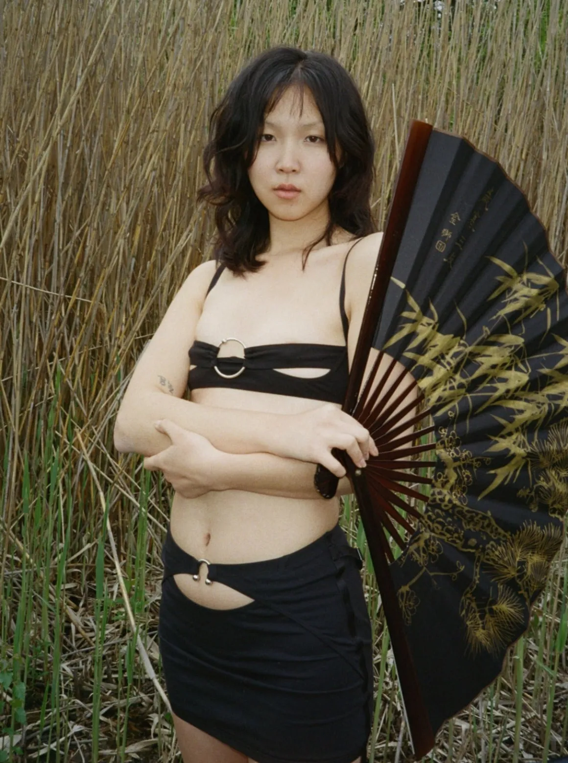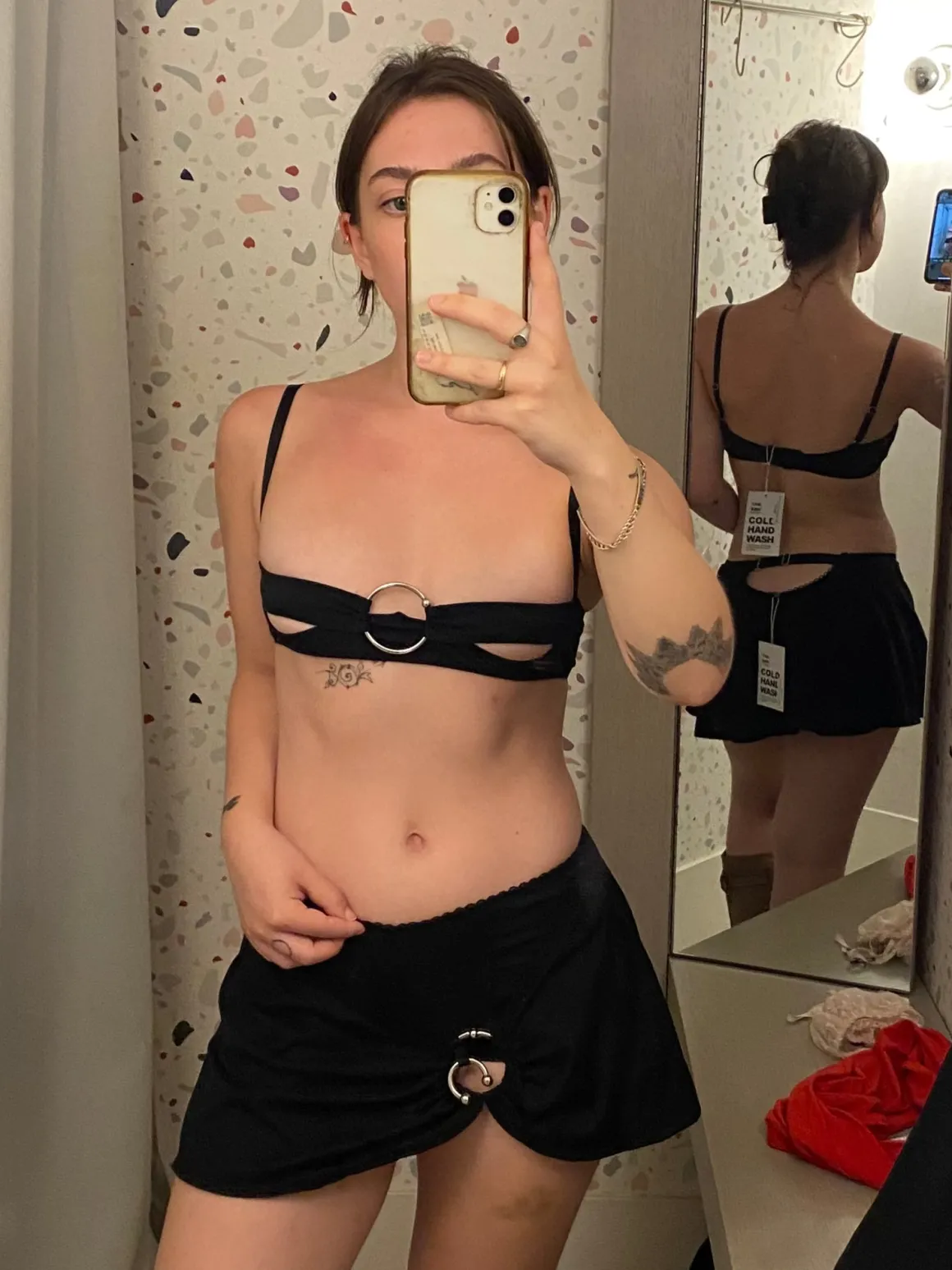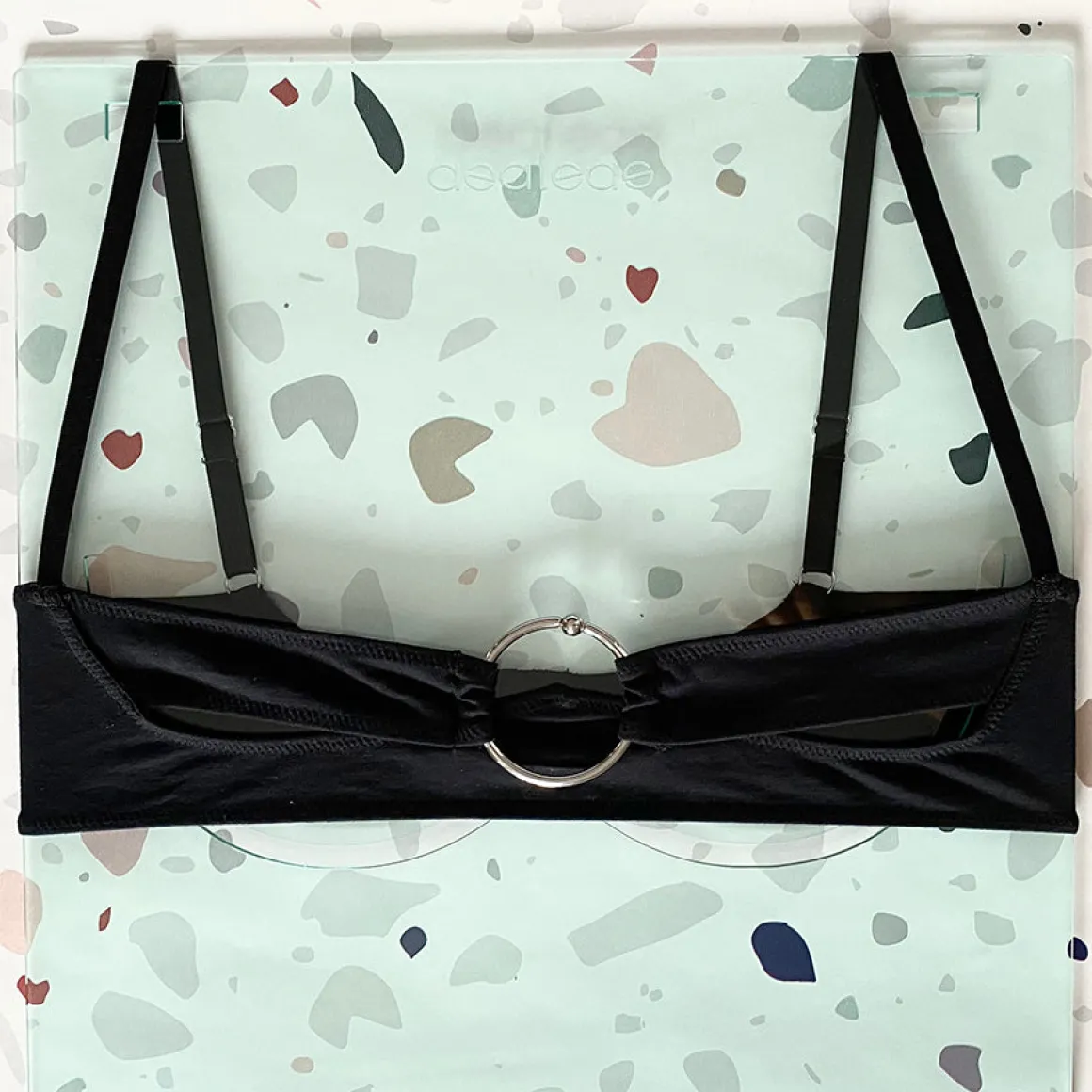Leave little to the imagination with this peekaboo bralette – the label’s most requested style. Delicate adjustable straps on half cups, complete with a largecircular barbell detail in the center.