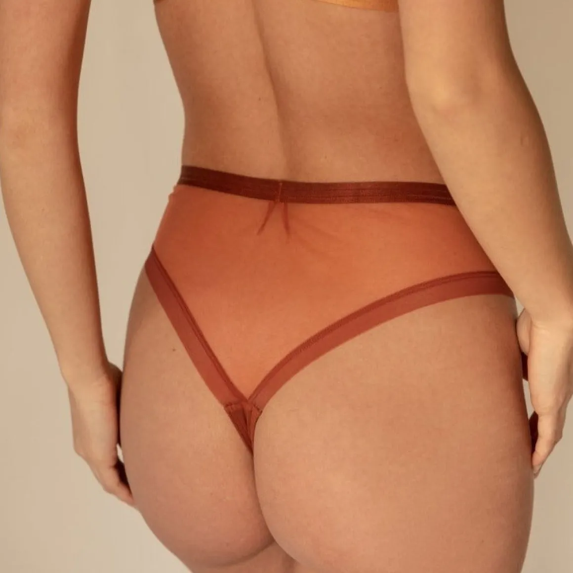 Seamless lightweight Italian mesh high-waisted thong in earthy sienna color. Silky smooth trim.