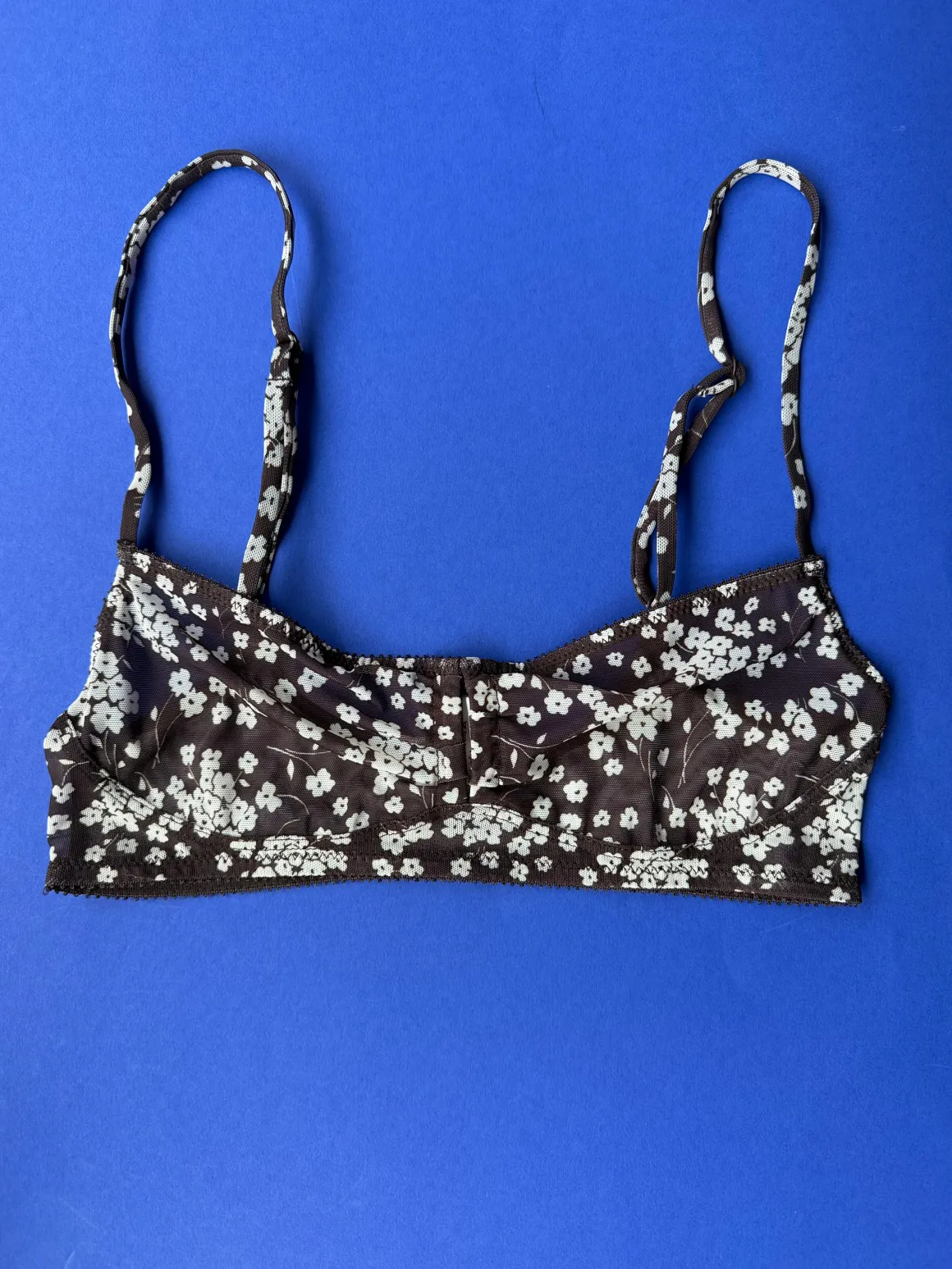 The sweetest little floral semi-sheer bandeau bralette with delicate adjustable straps and center keyhole finished with a couple of flower embroideries.
